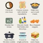 Meal prep hacks can help make healthy meals with maximum flavor and minimal effort. The best hacks for meal prepping are to focus on one meal at a time, choose recipes with minimal ingredients, make one-pan or one-pot meals, make double batches, buy prepared sauces, dressings, and veggies, use the slow cooker, freeze in individual portions, and make no-cook meals.