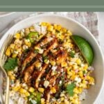 Loaded with fluffy rice, grilled chicken, and street corn salad, these street corn chicken rice bowls are a delicious and flavor-packed summer meal. They make a great weeknight dinner or healthy meal prep idea.